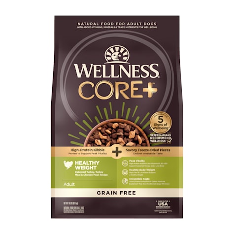 Wellness core rawrev is a line of high protein natural dry dog food kibble with pieces of freeze dried 100 meat mixed in.